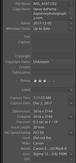 The Meta data important stuff is toward the bottom of this panel which shows. Exposure 0.3sec at f29 Focal, length 20mm, ISO 50, Flash Did not fire, Canon 5D Mark II, Sigma 12-24mm